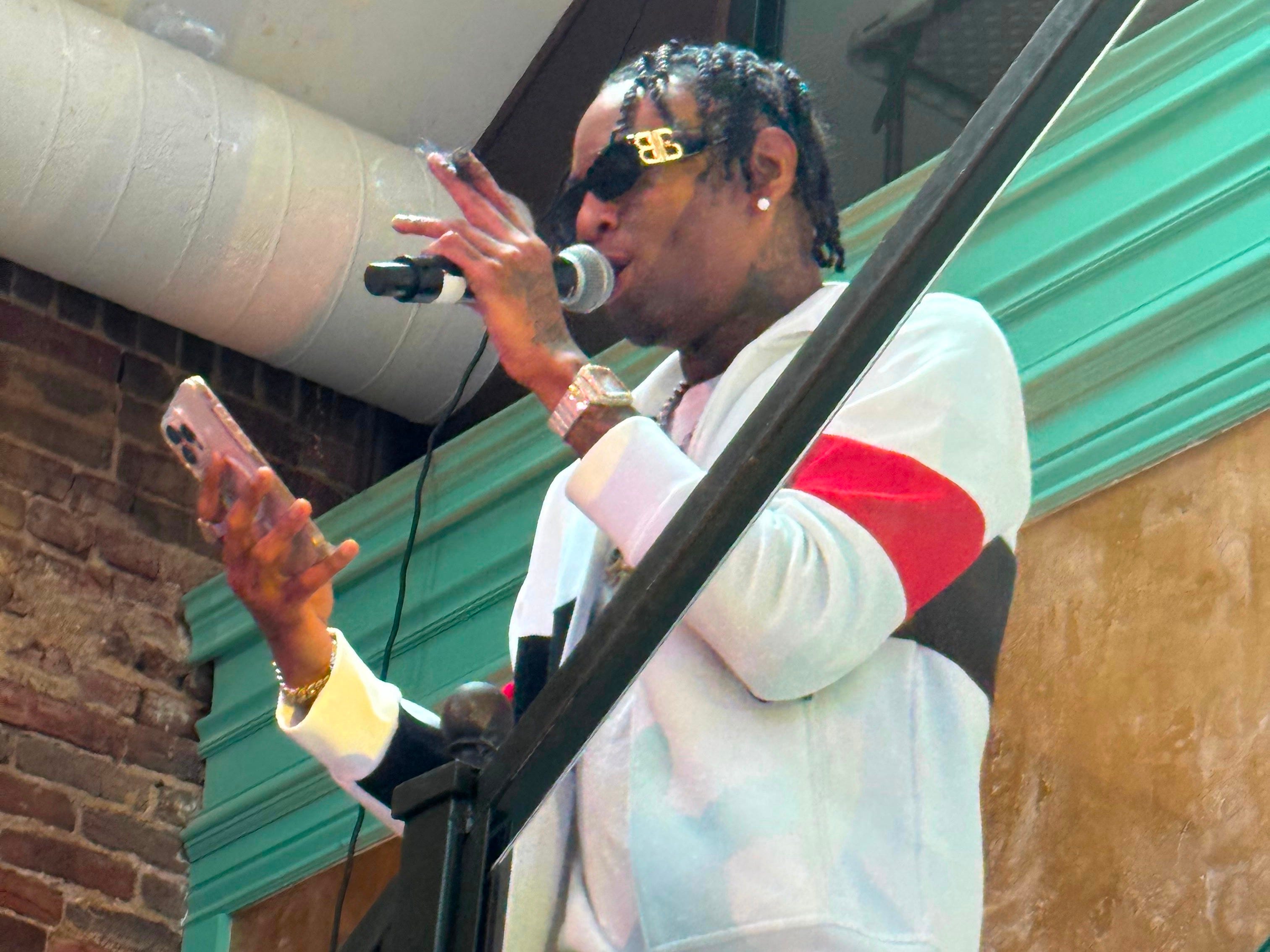 Halfway through the event, the organizer, Pearson, who is black and also co-chair of the Republican National Committee’s Youth Advisory Council, gave a speech deriding the “fake news” media for their reporting that they had previously thrown an all-white party, “So we threw an all-white party,” he said, referring to the dress code. After his speech, I heard Pearson say something to the effect of “Kash Patel,” only to see the FBI Director’s girlfriend, singer Alexis Wilkins, take the stage and sing “God Bless the U.S.A.” Soulja Boy then walked up the steps, joint in hand, and performed his featured act to the cheering crowd.