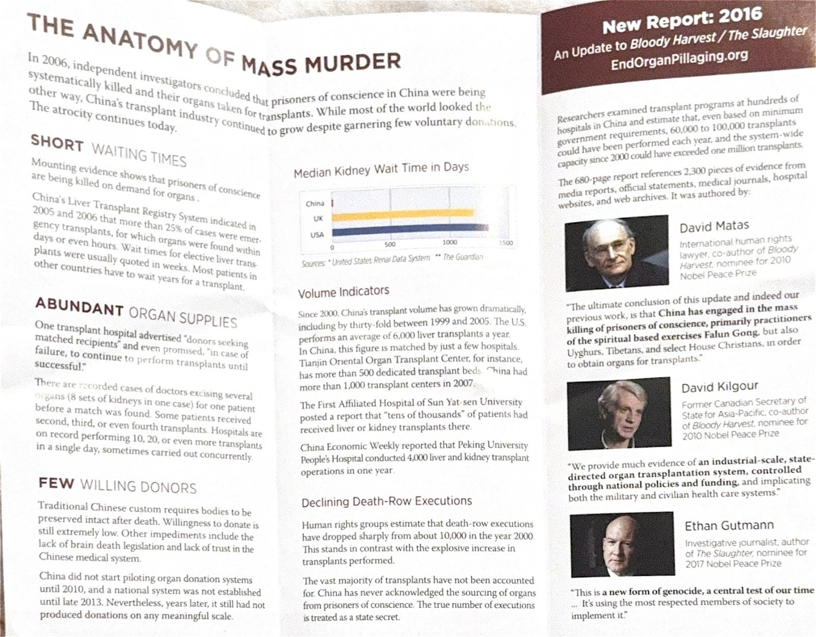 One of the most prevalent allegations that Falun Gong makes against the CCP is that it orchestrates organ harvesting. Outside the Columbia gates, Sundial obtained a pamphlet from Falun Gong claiming that the CCP is harvesting organs from its practitioners, Uyghurs, Tibetans, Muslims, and Christians for government officials. The evidence lacks some key datapoints, with numerous allegations circulating and the CCP refusing to release data that would assist in an “effective investigation and prosecution of traffickers.”