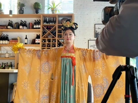 The advertised “Asian food” consisted of several drab mooncakes, a tray of prawn crackers, and a sparse array of grapes and apples. The “traditional couture show” was one woman dressed in a Tang Dynasty costume who strolled lethargically around the restaurant and posed intermittently.