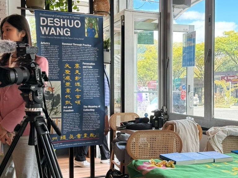 The inside of the restaurant was quieter than the streets outside. The event had attracted only around eight people, all of whom were Chinese, gazing around the room. I watched a young woman dryly present a slide deck on a portable TV with a camera pointed at her, which the club’s chairman explained was for a TV station. Copies of Zhuan Falun, the central text of Falun Gong, were lying on a nearby table. At the same table stood a banner promoting Deshuo Wang, a Chinese calligrapher, painter, and avid Falun Gong practitioner, who spent most of his time dozing off or scrolling on his phone during the event.
