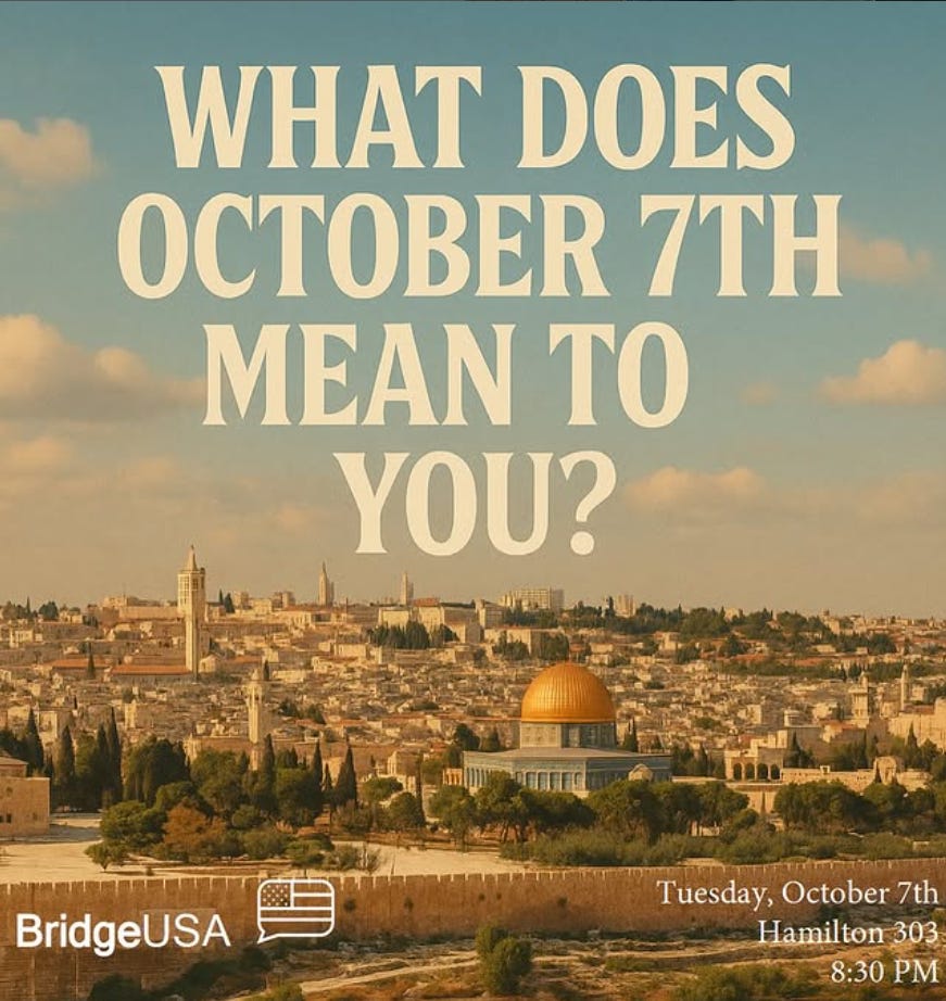 A quick review of their Instagram reveals that for other discussions, Bridge has managed to produce neutral advertisements with astonishing regularity. Examples include posts titled, “The Era of Zohran: Sunrise or Twilight in NYC?”, “Golden Age or Hellscape: Is the New Right, Represented by Figures Like Charlie Kirk, Good for Our Country?”, and “AI and Public Policy: Threat or Opportunity?” Even for discussions that weren’t advertised by presenting two equal sides, Bridge’s other posts have neutral, subject-defining titles like “The Trump Administration Wants to Instill Federal Oversight of Columbia University,” “A Discussion on Death and Political Violence,” and “The Rise of Red Pill Men.” Only for the Israeli-Palestinian conflict did Bridge seem to bias their advertising, perhaps because of the subject’s history of emotional reactivity at Columbia (including the aforementioned building takeovers and lawsuits that have cost the University millions).