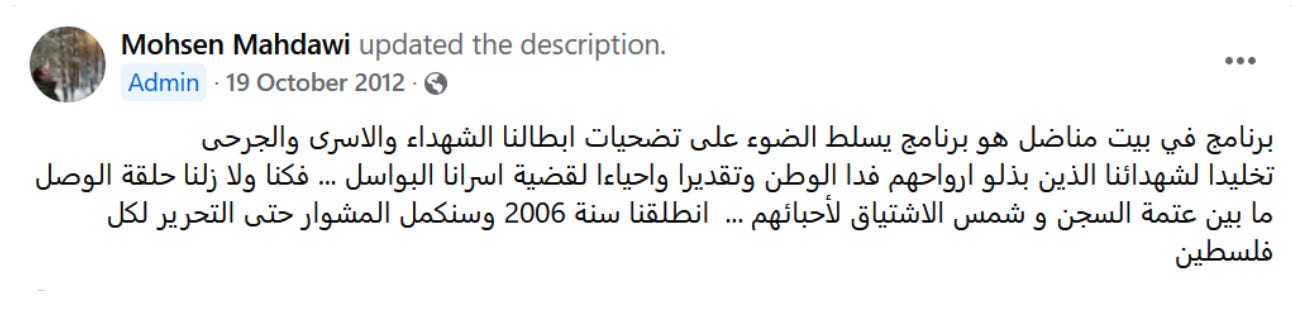 Mahdawi led the Fatah student movement at Birzeit University in Ramallah. In 2012, he launched a Facebook group to publicize “In the House of a Fighter,” a TV program produced by his mother, Abeer Shamali, to extol terrorists. Mahdawi also posted several tributes to Hamas and PFLP militants and promoted a poem commemorating Dalal Mughrabi—a Fatah operative who murdered 38 Israeli civilians, including 13 children.