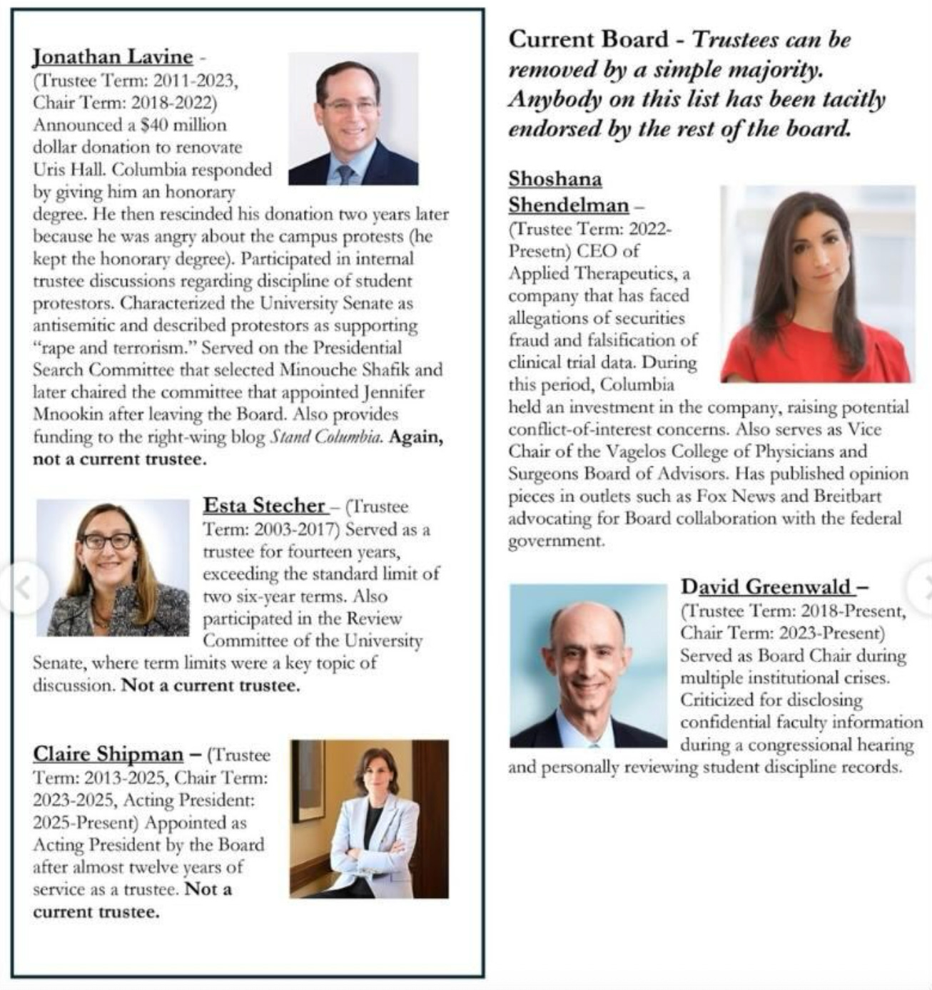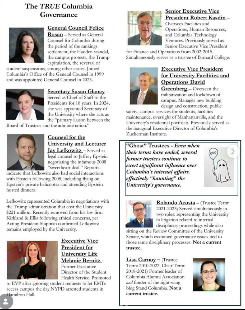 Let me be clear—our leadership is corrupt and rotten to the core. Shoshana Shendelman lied to the FDA about her pediatric drug; Jonathan Lavine, a vulture capitalist who ran Bain Capital, described protesters as supporting “rape and terrorism”; Jeh Johnson was architect of the US drone strike policy that killed hundreds of civilians, was on the board of Lockheed Martin, and claimed during his tenure as DHS head that it would be necessary to “send a message” by locking up mothers and children fleeing violence; Abigail Elbaum—a nepo baby and the Milstein Family’s current representative on the Board—was sued for refusing to refund tenants after Superstorm Sandy; Victor Mendelson is CEO of the war profiteer HEICO Corporation.