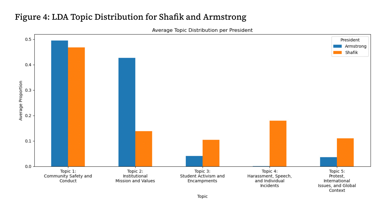 The LDA model reveals a split in administrative focus. Shafik emphasized student activism, harassment, speech, and protest slightly more than Armstrong. This is understandable, given the encampments and spike in antisemitic incidents on campus following the October 7 Hamas attacks. On the other hand, it seems that Armstrong made a concerted effort to prioritize “Columbia’s values,” no doubt in response to the events of the previous year and the Trump administration’s scrutiny of the University. Nearly half of each president’s emails were centered around campus safety, reflecting how heavily the issue shaped their messaging.