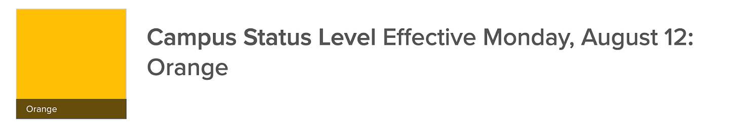 Orange means that campus is open to CUID holders only, as well as to select members of Within Our Lifetime who want to celebrate their marriage on the West Lawn.