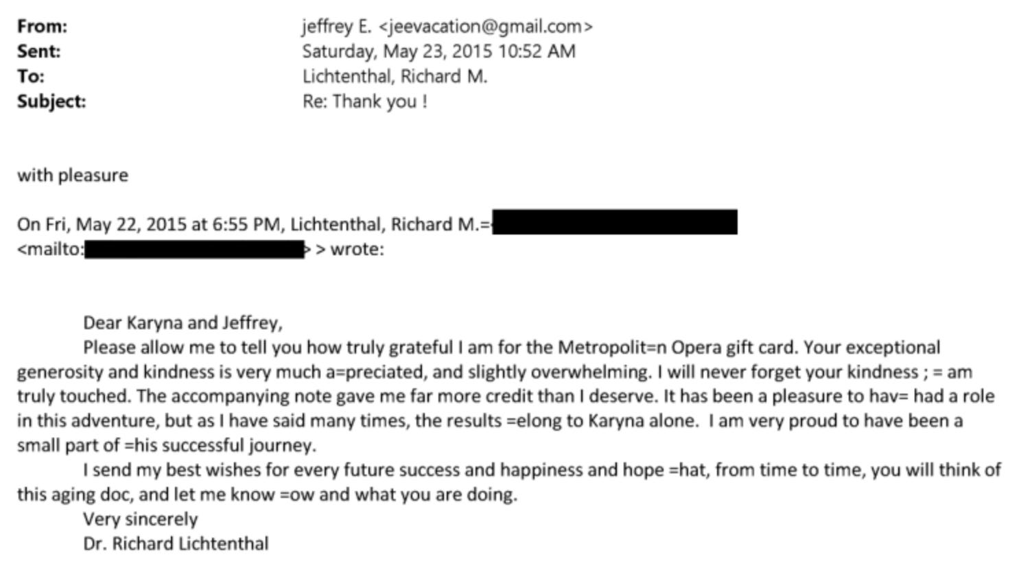 Lichtenthal continued to correspond with Epstein and Shuliak after Shuliak’s graduation, receiving a gift card to the Metropolitan Opera in May of 2015: “Your exceptional generosity and kindness is very much a=preciated [sic], and slightly overwhelming. I will never forget your kindness ; = [sic] am truly touched.” In the same thank-you email, he wrote effusively that he sends his “best wishes for every future success and happiness and hope[s] =hat [sic], from time to time, you will think of this aging doc.”