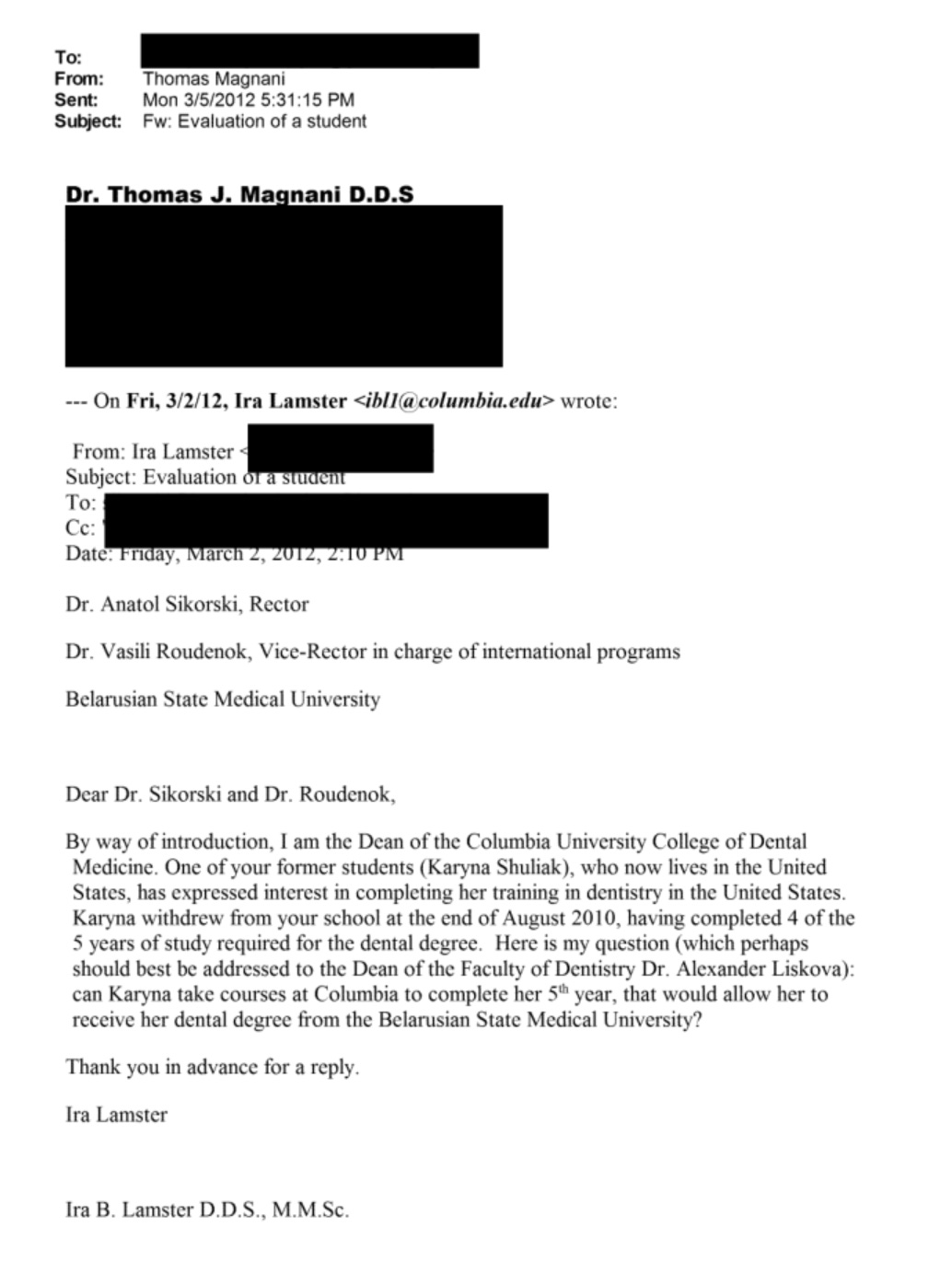 As first reported by Campus Reform, on March 2, Lamster wrote to Drs. Sikorski and Roudenok, Rector and Vice-Rector of Belarusian State Medical University, about Shuliak, who had “completed 4 of the 5 years of study required for the dental degree,” asking if she could “take courses at Columbia to complete her 5th year, that would allow her to receive her dental degree.”