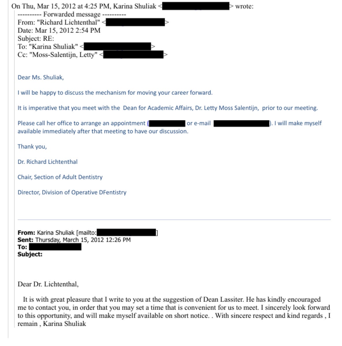 Even more unorthodox measures were taken to provide Shuliak with all the requisite resources to succeed in her application and her time at CDM: On March 15, she emailed Dr. Lichtenthal to set up a meeting. He told her to meet with Dr. Moss-Salentijn, then the Dean for Academic Affairs; four days later, Moss-Salentijn had scheduled an appointment with both Shuliak and Lichtenthal. Moreover, on April 3, Lichtenthal emailed Shuliak about the logistics of the admissions exam to CDM: Not only did he give her the basic details of when and where the exam would take place, but he also attached an exam outline and downloaded review materials “too large to e-mail” on a flash drive for her to pick up. These actions seem to go above and beyond what most high-ranking deans would do for their students, let alone for someone who has not yet become their student. Clearly, there was some interest in associating with Shuliak—and, by extension, Epstein—that went beyond the boundaries of casual generosity.