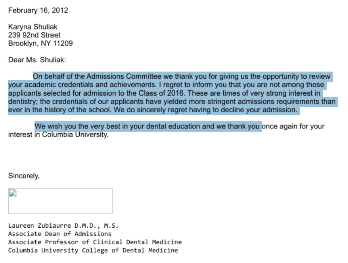 On February 16, Shuliak was rejected admission to CDM by Associate Dean Laureen Zubiaurre.