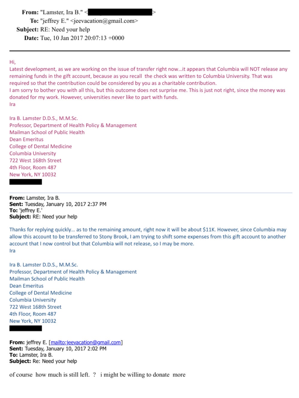 The motivation for his endorsement of Epstein’s character became evident two years later. In January of 2017, Lamster sent Epstein an email with the subject line of “Need your help.” “As you recall, you were kind enough to provide me with an unrestricted gift when I began my work at the School of Public Health,” he wrote. “After 28 years, however, I have decided to leave Columbia to explore some other opportunities.” He requested that Epstein “move those funds to Stony Brook to support [his] work there.” In a later email, Lamster wrote, “it appears that Columbia will NOT release any remaining funds in the gift account…I am sorry to bother you with all this,” he added, “but this outcome does not surprise me. This is just not right, since the money was donated for my work. However, universities never like to part with funds.”
