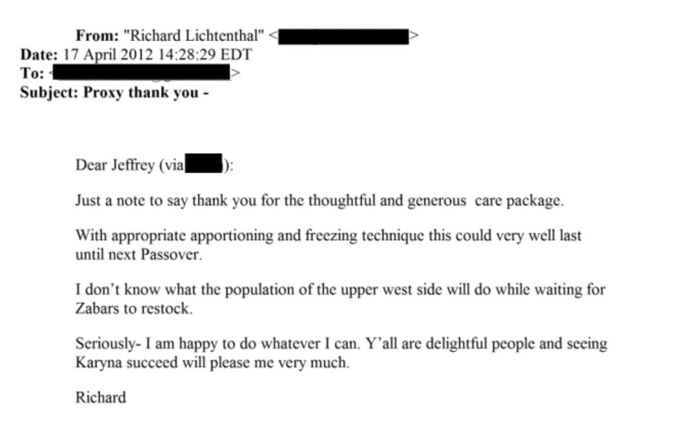 Then, on April 17, Lichtenthal received a “generous care package” (a Zabar’s gift basket) from Epstein and wrote to Shuliak as a “proxy thank you”: “I am happy to do whatever I can. Y’all are delightful people and seeing Karyna succeed will please me very much.”